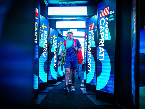 The Walk of Champions comprises a series of floor-to-ceiling LED screens, blue and white light from which illuminates the way to centre court. I wonder if the names and faces of past winners displayed on these screens is motivating or intimidating for the athletes as they make their way down. It’s a long walk, and the further you go, the hotter it gets. The air-conditioning is no match for the outside mercury at a certain point.