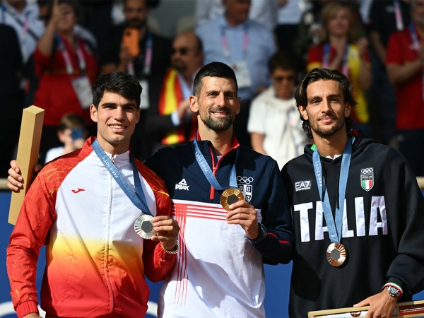 (L-R) Carlos Alcaraz, Novak Djokovic and Lorenzo Musetti were the men's singles medallists at the Paris 2024 Olympic Games. [Getty Images]