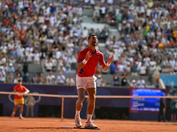 After one final forehand winner, Novak Djokovic celebrates the moment he won Olympic gold for Serbia in the Olympic men's singles tennis event at Paris 2024. [Getty Images]