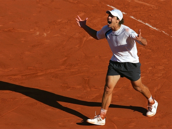 Argentina's Gaston Gaudio celebrates the moment he became Roland Garros men's singles champion in 2004, after trailing countryman Guillermo Coria by two-sets-to-love in the final. [Getty Images]